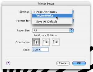 Print Scale was van origine alleen op de Macintosh beschikbaar. Omdat deze functie ook door Windows gebruikers node werd gemist heeft NNA het aan het programma toegevoegd. Kijk in het filemenu bij Page Setup. Op de Macintosh zie je daar een Schaal of Scale veld, het heeft beperkt bereik: van 25% tot 400%. Het is wellicht raadzaam om dit veld niet meer te gebruiken en alleen VectorWorks eigen schaal veld te gebruiken: Dit is te vinden onder het popupmenu van de Settings: Kies: VectorWorks. Dit veld lijkt niet gelimiteerd te zijn; ik gebruikte reeds waarden uiteenlopend van 1% tot 1000%.