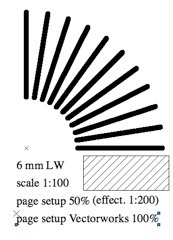 Het Macintosh Scale field (midden onder) toont (WYSIWYG) de verschaalde lijn-dikte. Dus print en beeldscherm zien er hetzelfde uit. Rechts onder het beeldscherm effect van Layer Scale. De print is net zo groot als bij de andere verschalingen, maar lijndikte en Hatch afstanden zijn niet verschaald.