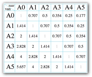 De tekenformaten A0 (841 x 1189 mm), die begint met een oppervlak van 1 vierkante meter, tot en met A11 (26 x 18 mm) zijn in oppervlak telkens 2x zo klein. Aangezien de verhouding constant is volgt daaruit dat de zijden telkens met de wortel van 2 verschaald worden: 1.414.....