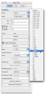 Een waarschuwing is wel op z'n plaats. Als in beide velden een waarde wordt ingevuld dan worden deze allebei toegepast: Macintosh Scale veld : 50% x Vectorworks Scale veld : 50% = 25%!!!!